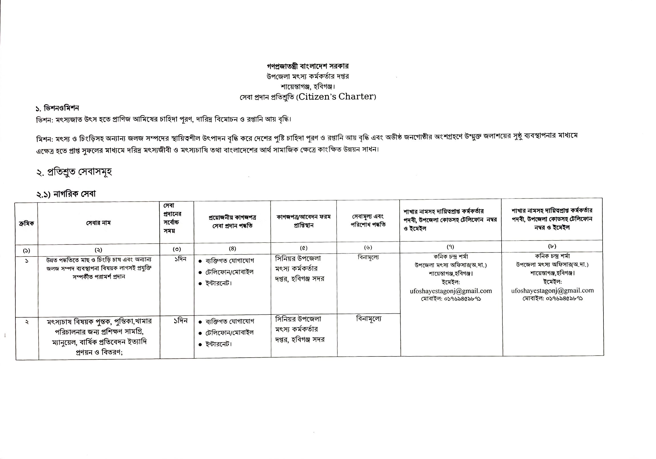 | ১ | মৎস্য উৎপাদন বৃদ্ধি কার্যকর ব্যবস্থা/পরিকল্পনা গ্রহনের মাধ্যমে জনগনকে পুষ্টি যোগান সহায়তা প্রদান। | মৎস্য চাষী /উদ্যোক্তা | অফিসের সময় |